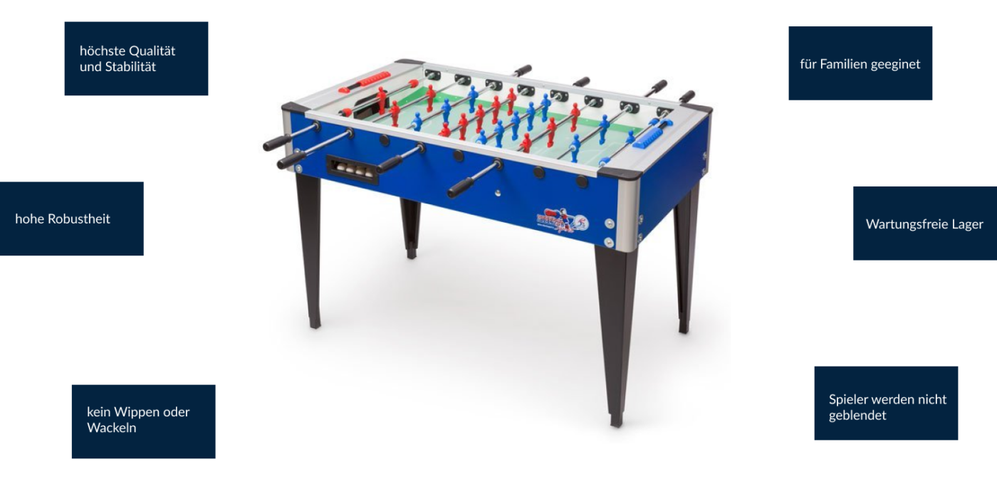 Unsere Tischkicker sind mehr als nur ein Spiel – sie sind ein Symbol für Zusammenhalt, Wettbewerb und unzählige Stunden unterhaltsamer Momente. Mit einer breiten Palette von Stilen, Grössen und Anpassungsoptionen finden Sie bei uns den perfekten Tischkicker, der nicht nur Ihren Spielstil, sondern auch Ihren Wohnstil ergänzt.